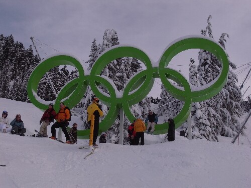 これは最近ウィスラーに設置されたアルペン会場ゴール地点の五輪のマーク。バンクーバーオリンピックのコンセプトの一つに持続可能、エコというテーマがあるが、緑だけの五輪のマークはそのシンボル。