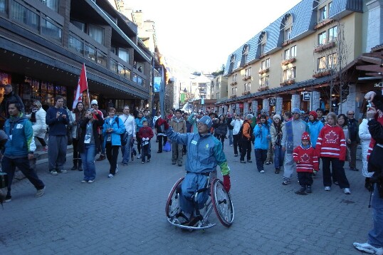その後ウィスラーゴンドラでビレッジに到着したトーチは、ライブバンドの歓迎コンサートの行われるビレッジ広場とスキーヤーズプラザを何人もの手によってリレーされた。