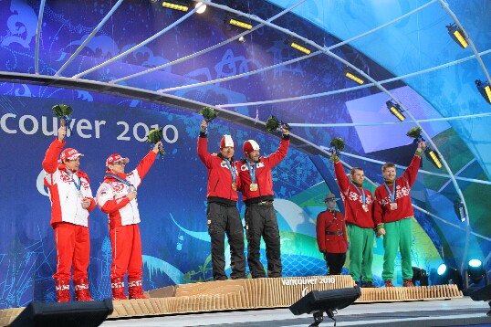 夜7時からは毎日ビクトリーセレモニーが行われていて、3月15日はカナダ待望の金メダルをXCの視覚障害のブライアン・マッキーバー選手とガイド役のロビン・マッキーバー選手が獲得した。