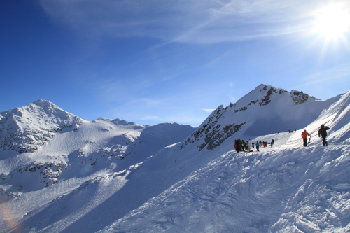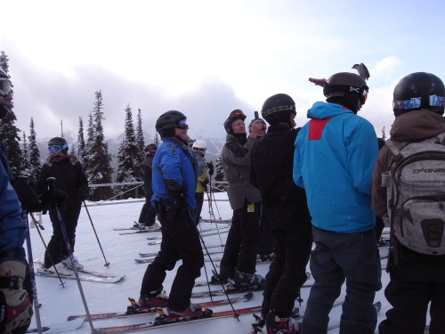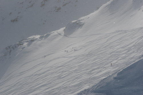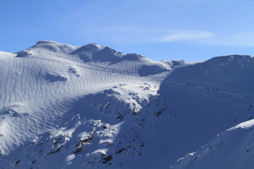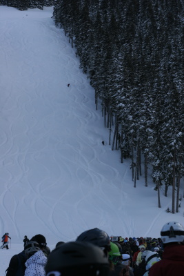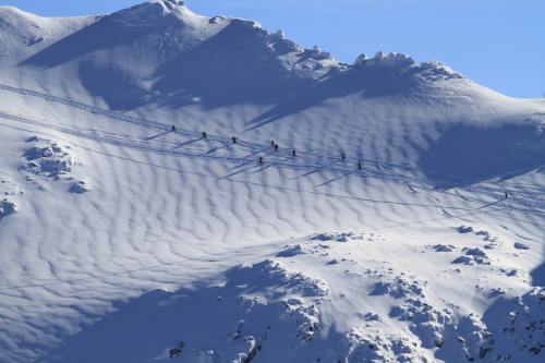 奥のバックカントリーエリア、スピアヘッド氷河やデッカー山、ディジーズリッジに向かっていて、この瞬間だけでも50人ぐらいが歩いている。
