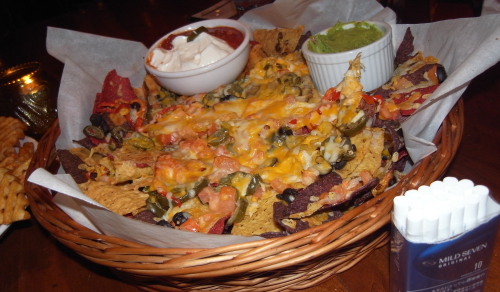 これはコーントルティーヤチップにチーズやチキン、サルサソース、オニオン、ハラペーニョなどのせてオーブンで温める。ワカモレ(アボガドディップ)やサワークリームディップで食べるウィスラーB級グルメの定番中の定番。