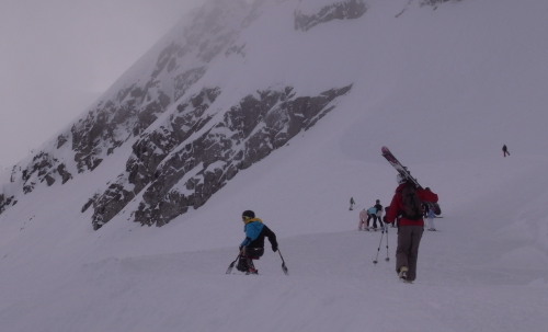 そしてブラッコム氷河エリア。朝の10時ぐらいにオープンしたので、多くの人が朝一番の極パウを狙ってハイクアップ。おなじみの光景です。