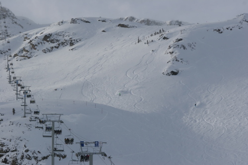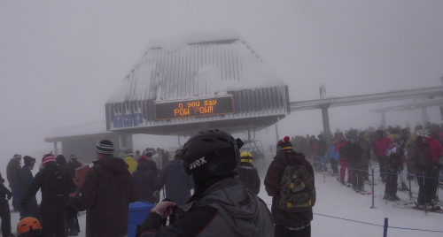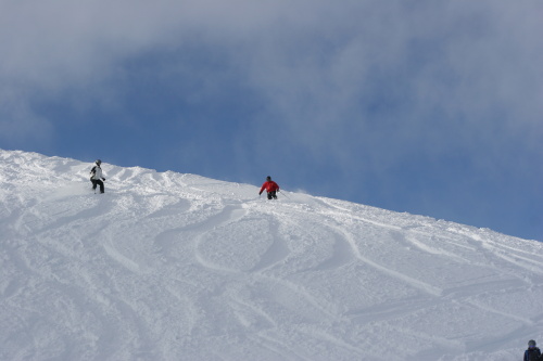 ずっと晴れが続いて機嫌の悪かった人たちも、土曜日から始まった降雪に大喜び。日曜日で殺気立った混雑が終わるかと思っていたが、月曜日でも650人限定のフレッシュトラックに、朝6時50分に並んでも足きりで「みんな働いているの?」っていう感じ。というかとりあえずは滑ってから仕事ですかね?