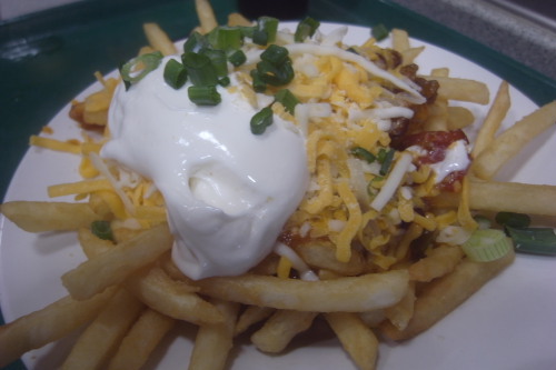 クラッシック・プーティーンがポテトフライにチェダーチーズ、グレービーソースなのに対し、チリ・プーティーンはサワークリーム、チリソース、チェダーチーズ、ねぎを散らしています。