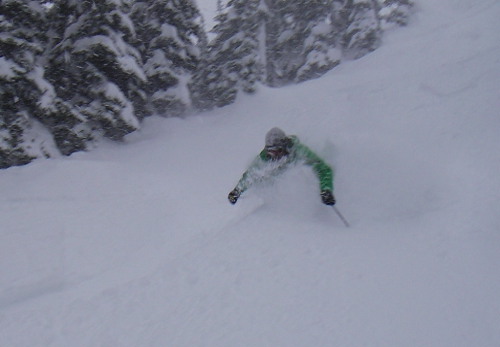 3月10日、北海道の美利河(ピリカ)スキー場のインストラクターの方。グリーンのユニフォームがとてもかっこよく、みんなで滑っている姿がウィスラーで目立っていました。