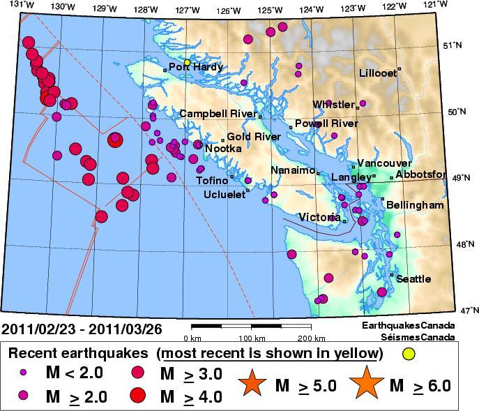 ところで、RING OF FIRE(環太平洋火山帯)の一員であるカナダBC州の、最近の地震の状況がフェイスブックの○○さんによってFYI(For Your Info)としてアップされていた。