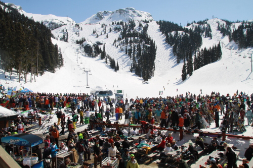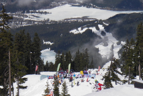 ブラッコム山のグレーシャークリークレストランの前ではパームベイ・スラッシュカップが行われていました。この標高は(1545m)はちょっと春の陽気。