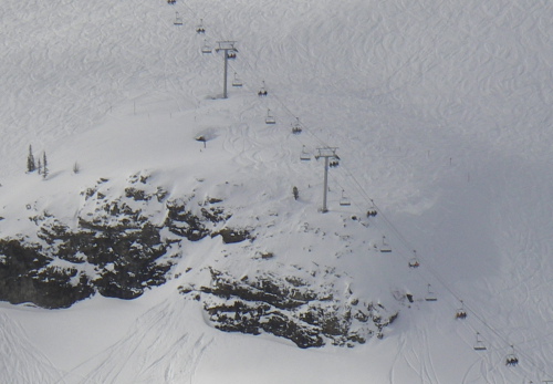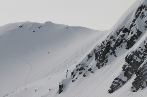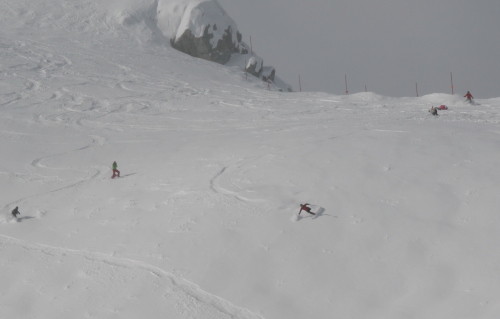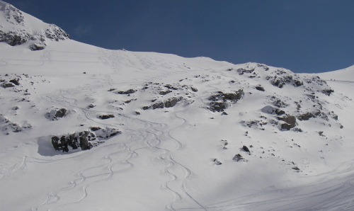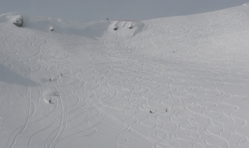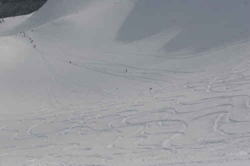 ちなみに僕のシュプールは右端のちょろっと岩の間です。