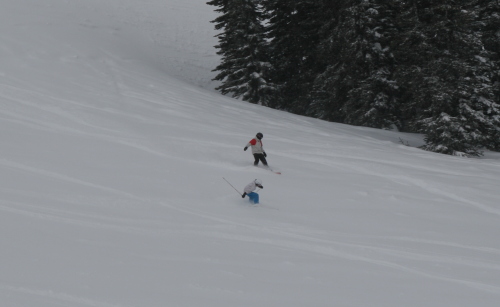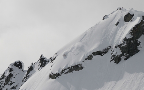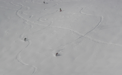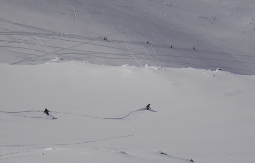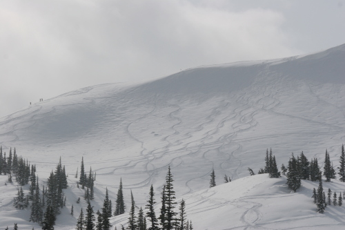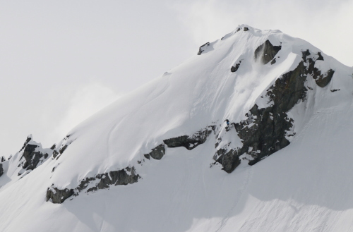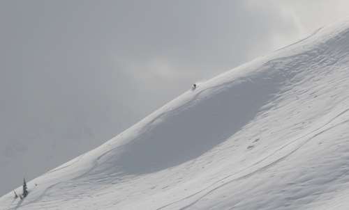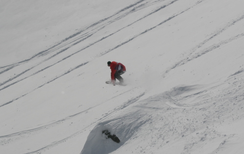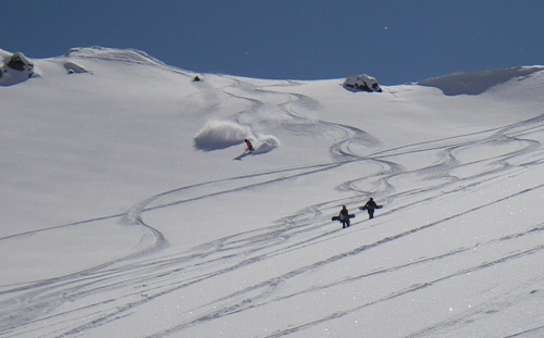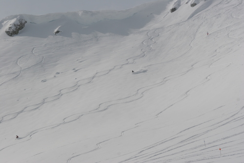 この日はブラッコム氷河のプープ(うんち)シュートエリアは、ちょっと日が当たって重めでしたが4月としては充分な新雪。