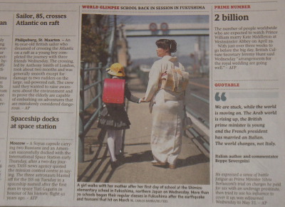 今朝の地震とは関係ありませんが、カナダ全国紙でも日本の福島で新学期が始まったという写真が掲載されていました。