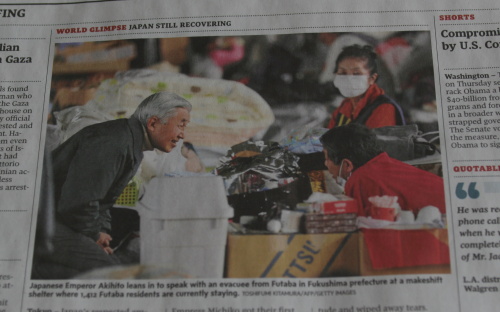 日本のニュースはちょっと遅れてくるみたいだけれど、釜石市の小学校入学式の様子が一面トップの写真でした。