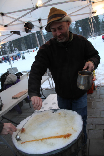 普通にメープルシロップを温めて、降りたての雪の上にかけて固まったところをスティックでくるくる巻いて食べちゃう。