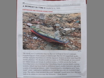 ところで昨日は3月11日。カナダ全国紙:Globe and MailのA Moment In Time のコーナーには東日本大震災の記事が載っていました。