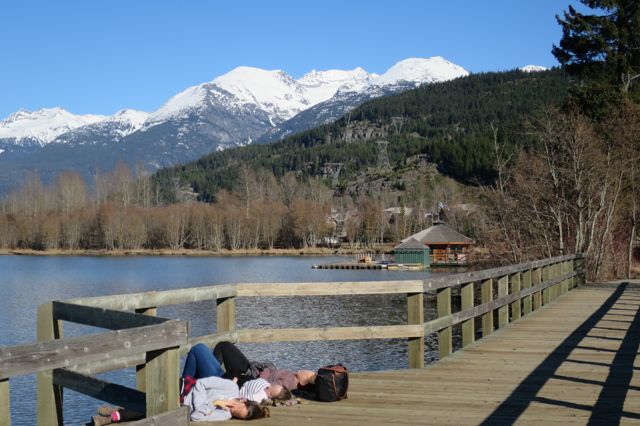 ウィスラーらしい風景で、それぞれのスタイルで5月のような3月を楽しんでいる。