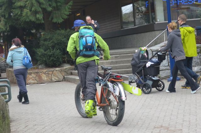 ビレッジに戻ると、スキーをつけたファットチャリがパブに停めてあったので、どんな人が乗っているのかなあ?ってみていたら、ブーツのままパブから出てきてそのままチャリに乗っていった。