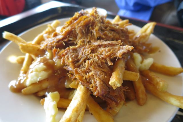 プルドポーク・プーティーン。甘く味付けした引き裂き肉をプーティーンの上にガッツリのっけたもの。